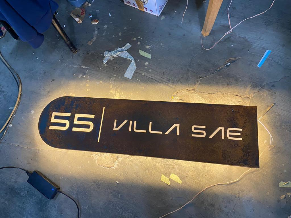 For a main entrance wall sign, 60–100cm wide is typically readable at walking and driving pace from the lane. Freestanding compound signs work well at around 100cm × 75cm. For dimensional letters, a logo block around 60cm wide with a 5cm subtitle line is a proven format. Villa unit numbers at 15cm height per digit are readable and standard.